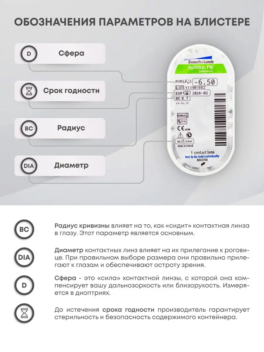 Optima FW – это высококачественные трехмесячные контактные линзы от компании Bausch&Lomb, которые идеально подойдут тем, кто ценит комфорт и четкость зрения. Эти линзы выполнены из гипоаллергенного полимера полимакона, что делает их безопасными даже при длительном использовании. Они имеют широкий диапазон оптической силы от -0.50 до -9.00 дптр, благодаря чему каждый может подобрать себе подходящую пару. Кроме того, они оснащены ультрафиолетовым фильтром, который защищает глаза от вредного солнечного излучения. А влагосодержание составляет 38%, что гарантирует увлажненность глаз на протяжении всего дня использования. И все это по привлекательной цене.