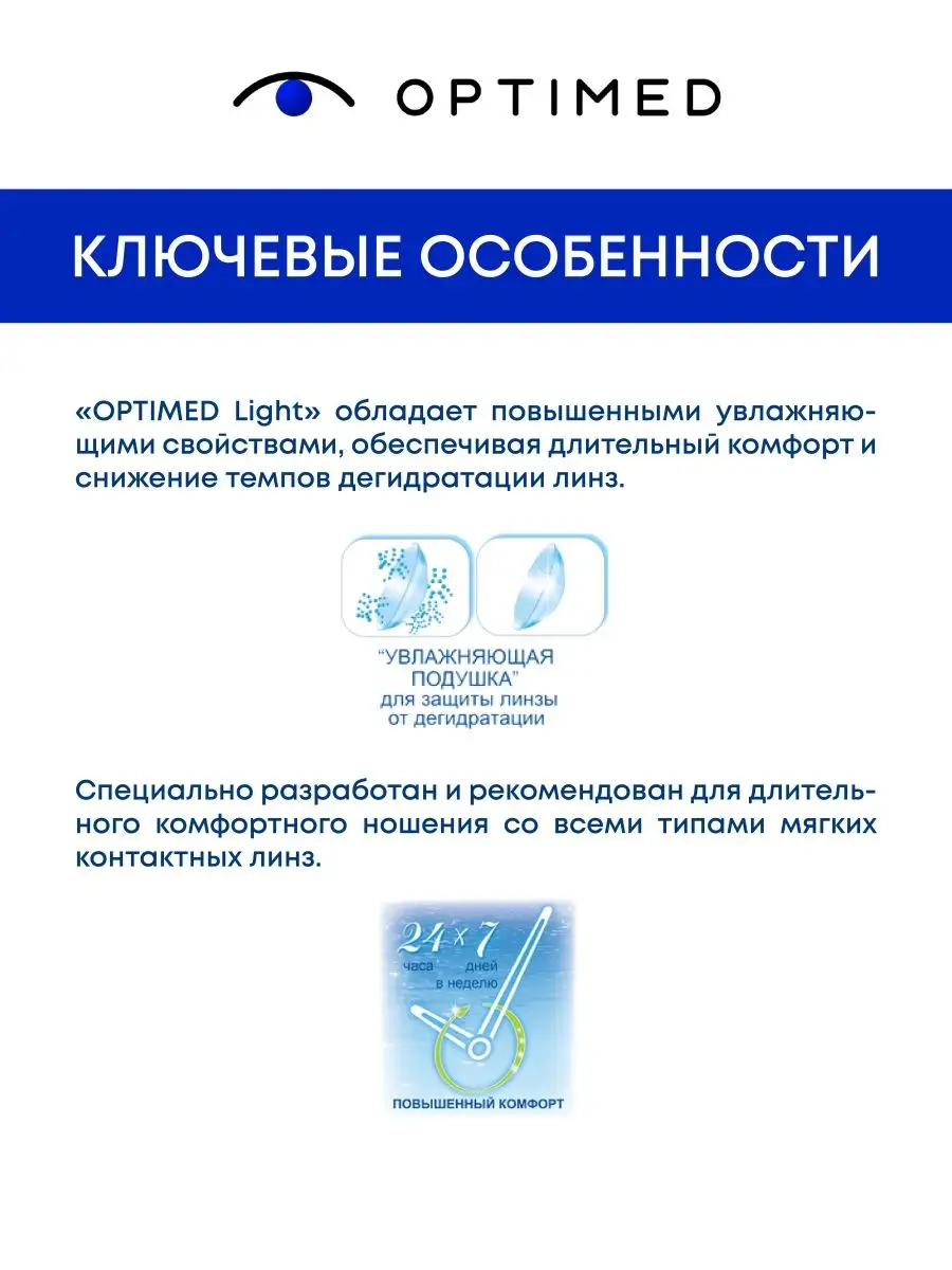 Универсальный раствор Optimed Light подходит как для ежедневного ухода, так и для длительного ношения контактных линз. Благодаря своему составу, включающему мягкие компоненты и широкий спектр действий против различных бактерий, этот раствор помогает поддерживать чистоту и свежесть ваших линз каждый день. Независимо от типа вашей активности – будь это работа за компьютером или активный отдых – Optimed Light позаботится о вашем зрении и подарит вам ощущение комфорта весь день!