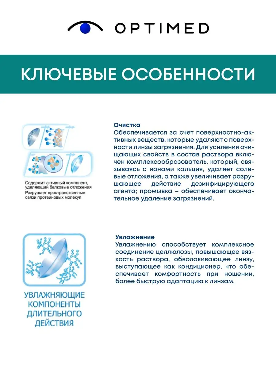 Универсальный раствор Optimed Plus предназначен для эффективной дезинфекции, очищения и длительного комфортного хранения мягких контактных линз всех типов. Благодаря специально подобранным компонентам он обеспечивает бережное отношение к материалу линз, сохраняя его первоначальные характеристики. Входящий в состав боротный буфер поддерживает необходимый уровень pH, создавая оптимальную среду для безопасного хранения, а увлажняющие полимеры предотвращают пересыхание линз. Раствор легко справляется с любыми загрязнениями, включая белковые отложения, гарантируя чистоту и свежесть ваших глаз каждый день.