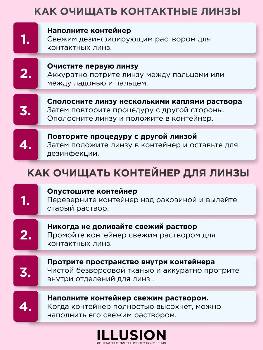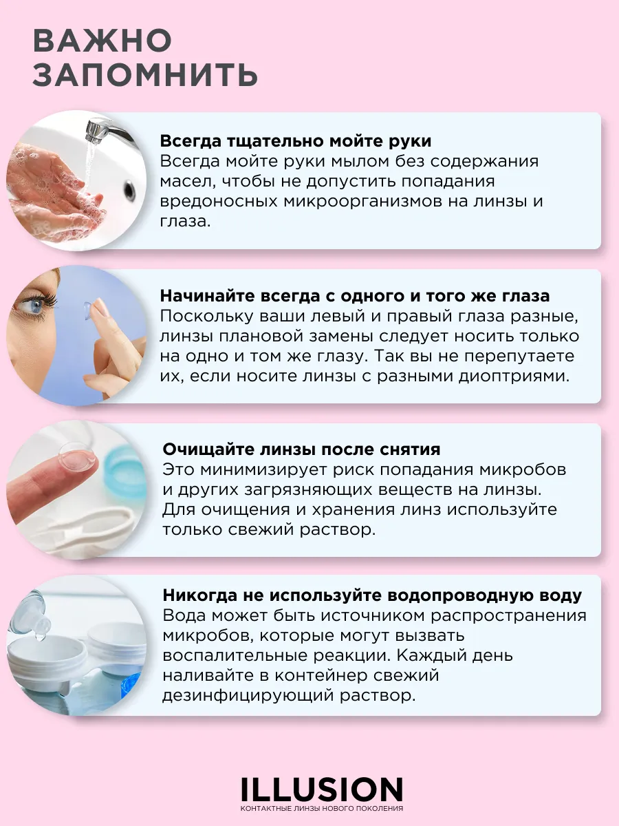 После покупки линз, вы должны помнить о необходимости ухаживать за ними. Для очистки изделия от микробов (от белковых и липидных отложений , профилактики инфицирования линз) необходимо использовать многофункциональные растворы. Подобные растворы вы с легкостью найдете на нашем сайте Линзынадом24.рф